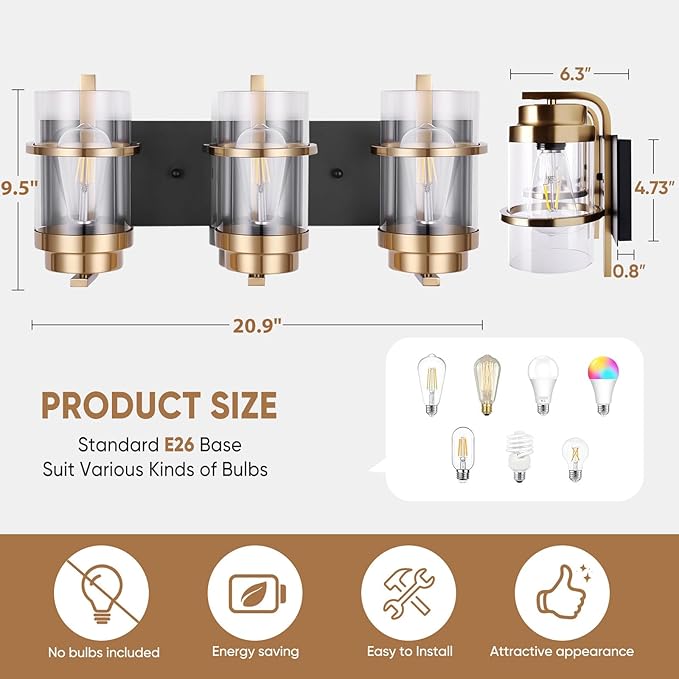 • Product Feature: Hardwired.Black gold bathroom light fixture with clear glass shade;Modern Wall Sconce lighting is easy to install and can be mounted as either up light or downlight.