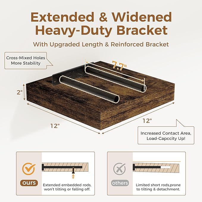 Fun Memories 12 Inch Floating Shelf, Rustic Wood Wall Shelves for Wall Decor & Storage, 12 x 12 Floating Shelf for Living Room, Bathroom, Bedroom, Rustic Brown, Set of 2