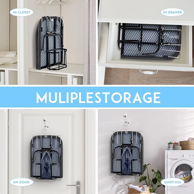 - ALL IN ONE STORAGE STABILITY- Iron and ironing board set never lose your iron again! When using a small ironing board, pulling out the iron holder can place the iron. Even if the iron is still warm after ironing, it can be placed directly in the storage basket. No more worries about storing irons