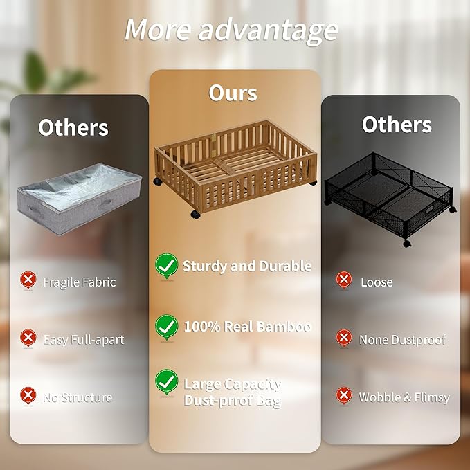 • Easy Assembly & Fit Most Beds: Simple assembly required, and the compact design fits under most standard beds. Transform the wasted space under your bed into a functional storage area with these bamboo under bed storage units.