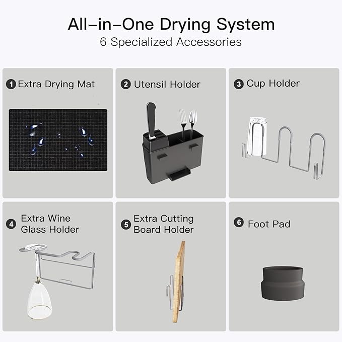 • ๐Ÿ› ๏ธ All-in-One Drying System: 7 specialized accessories: drying mat, utensil holder, drainboard set, wine glass holder, cup holders, cutting board slot, non-slip feet cover. Stores all dish types vertically or horizontally. Maximizes small kitchens