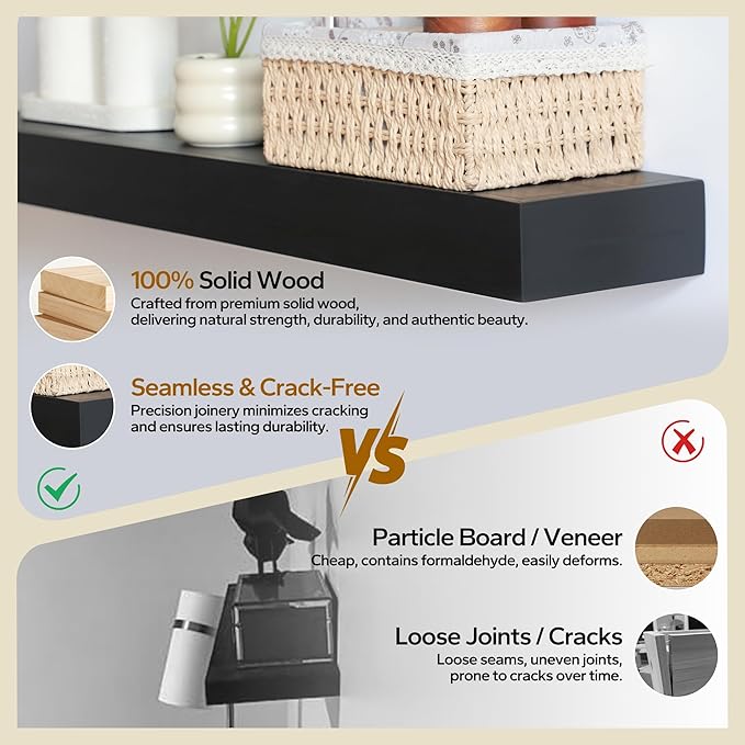 Floating Shelves 3 inch Thick for Wall Set of 2,Solid Pine Wood Wall Mount Shelf for Kitchen Living Room Bedroom Bathroom,8" D x 48" L x 3" H-Black