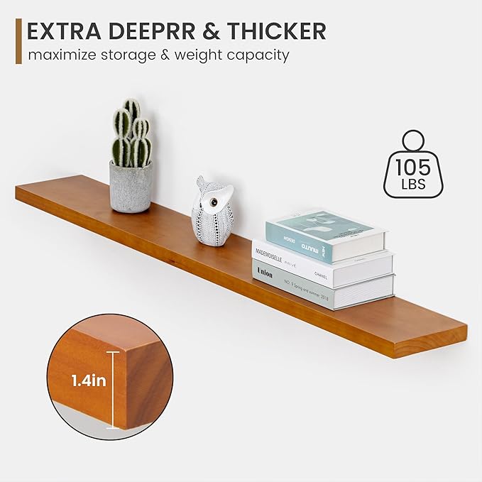 - Extra Deeper & Thicker for Storage - Each board measures 55"W x 8"D x 1.4"H. Extra deeper and thicker design in order to bring maximizes storage space and weight capacity, even hold up to 60 lb. This floating shelf taking up zero square feet, reduces clutter and highlights dÃĐcor in compact spaces. It can help make full use of the empty wall, making it much more space-saving and making your room look larger and tidier.