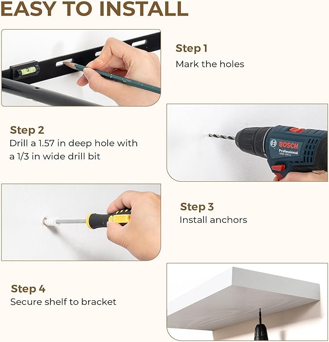 - Sturdy & Secure design: These 36-inch floating shelves feature a durable, concealed mounting bracket that offers reliable support for your belongings. Engineered for hassle-free and stable installation, each shelf includes all the required hardware to ensure a strong, wobble-free holdâperfect for showcasing your favorite decor, photos, or everyday items with confidence and style.