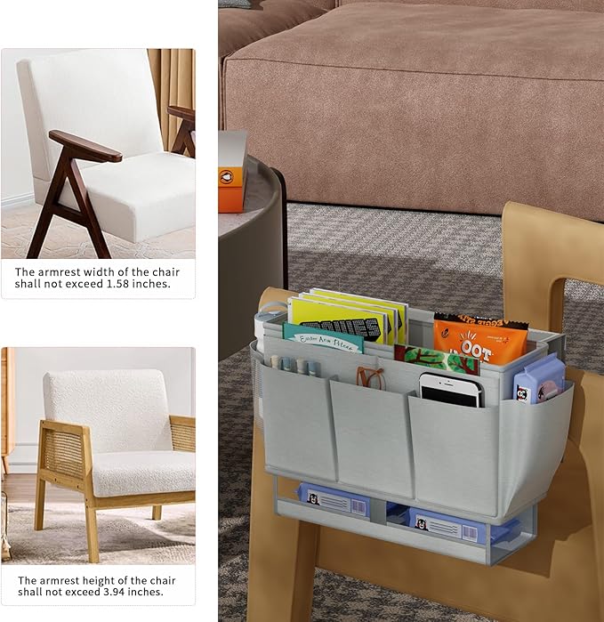 - Product Size: The overall size of the bed storage caddy: L13.78*H7.88*W3.94inch, pocket size: H5.52*W4.93inch, bedside storage is suitable for railing width less than 1.58inch.
