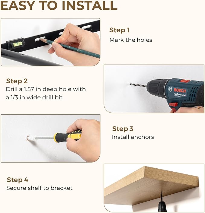 - Sturdy & Secure design: These 48-inch floating shelves feature a durable, concealed mounting bracket that offers reliable support for your belongings. Engineered for hassle-free and stable installation, each shelf includes all the required hardware to ensure a strong, wobble-free holdâperfect for showcasing your favorite decor, photos, or everyday items with confidence and style.