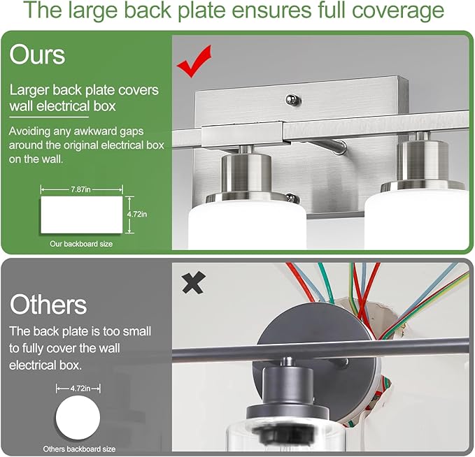 - Soft, Glare-Free Lighting with Frosted Glass: Milky white frosted glass shades deliver warm, diffused lightâperfect for grooming, makeup, or creating a relaxing ambiance. These bathroom lighting fixtures over mirror provide both style and function. The open-bottom design ensures easy bulb changes and improved ventilation.