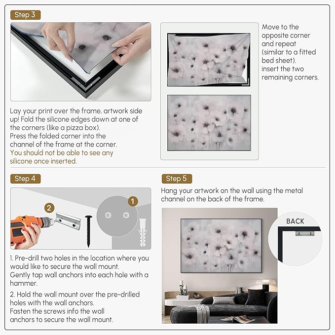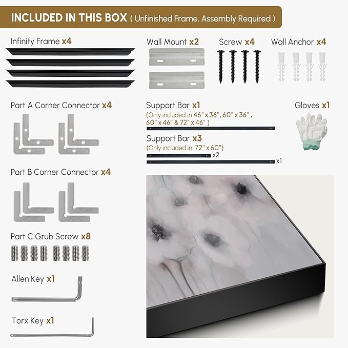 • Assembly Required: The artwork comes with the frame components unassembled. Don’t worry — setup is straightforward and tool-friendly. For best results and accurate alignment, we recommend two people to ensure a smooth assembly and a stable, secure wall mount.