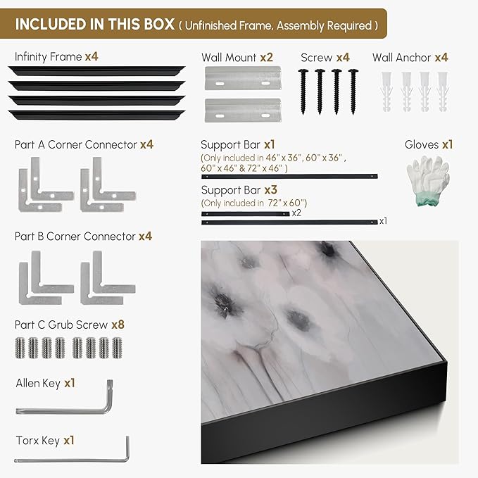 • Assembly Required: The artwork comes with the frame components unassembled. Don’t worry — setup is straightforward and tool-friendly. For best results and accurate alignment, we recommend two people to ensure a smooth assembly and a stable, secure wall mount.