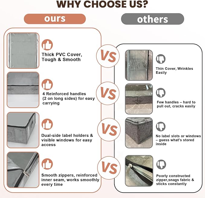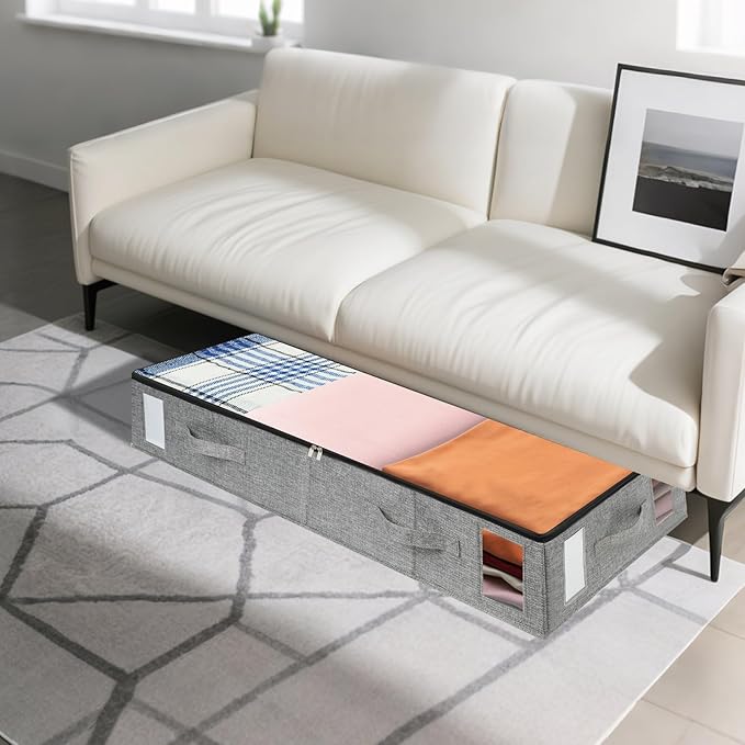 - Easy Access&View: Large clear top window allows you to to see whatâs inside easily; the label holders with blank cards on two sides for your mark, two visible windows help you identify the contents more quickly. 4 reinforced handles make it easy to carry and pull out from under the bed. Double strong metal zippers making for smooth and easy open and close