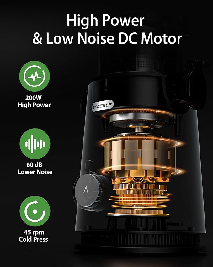 - 【Easy to Assemble & Clean】Our ECOSELF masticating juicier features a hopper & screen integrated design, which can be easily assembled and disassembled in minutes, and is also easy to clean. Except for the motor base, the remaining components can be rinsed swiftly with water, and the included brush ensures a seamless cleaning process.