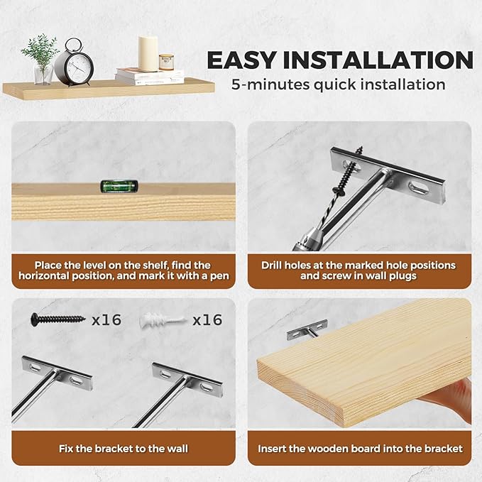 - Hassle-Free Installation: Comes with all necessary hardware for easy installation shelves, including brackets and screws. Perfect for DIY enthusiasts and first-time decorators