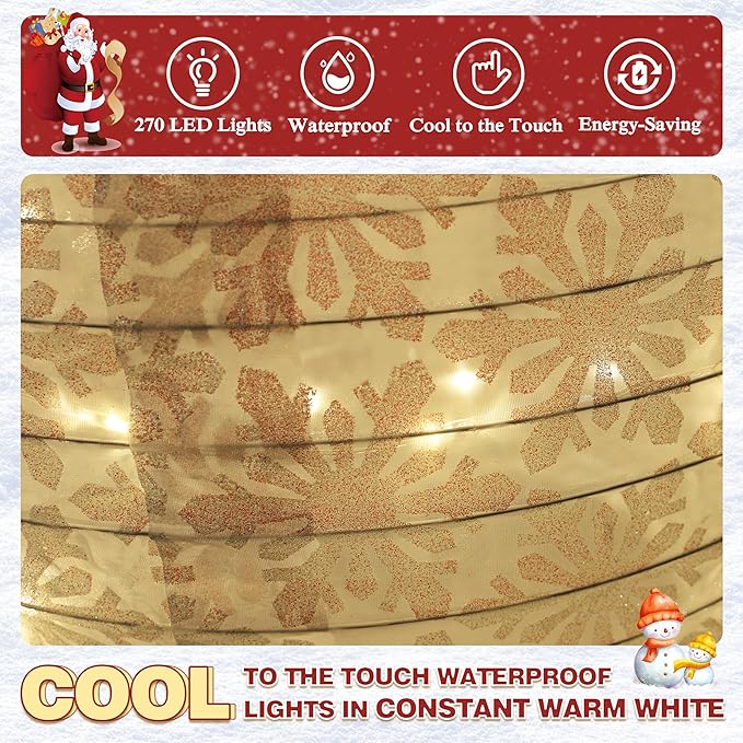 - Weather-Friendly Design: This freestanding holiday display is equipped with water-resistant cord and lights, the light bulb is waterproof and snow proof, so you don't have to worry about safety issues. Although, it has 270 LED lights, itâs still energy-saving. Besides, pre-strung fairy lights remain cool to the touch in constant warm white