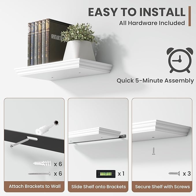 - Multi-Purpose Floating Shelves for Wall: Upgrade any space with these retro, sleek white shelves! Perfect as shelves for the room wall, book shelf for the wall, living Room, office, bedroom, bathroom, or kitchen shelves