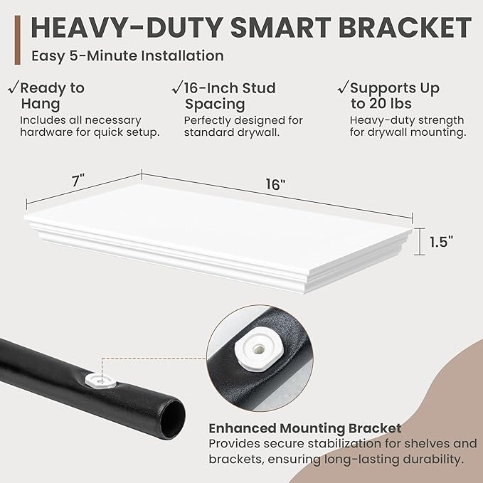 - Strong Suppoot: MDF wooden floating shelf with reinforced brackets supports heavy items effortlessly, holding up to 20 pounds. Hanging shelf's bracket has been preset with a 2° elevation to remain level and not sag after bearing heavy loads