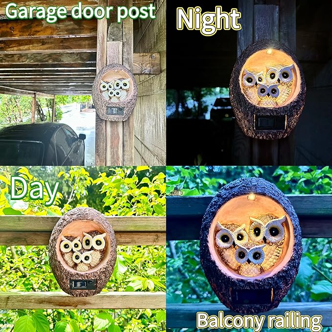 - Handcrafted Detail for Storybook Charm Featuring a whimsical owl family (parents + baby) peeking from a tree hollow, every feather and bark texture is intricately sculpted. The soft amber glow creates a cozy, fairy-tale ambiance day or night.