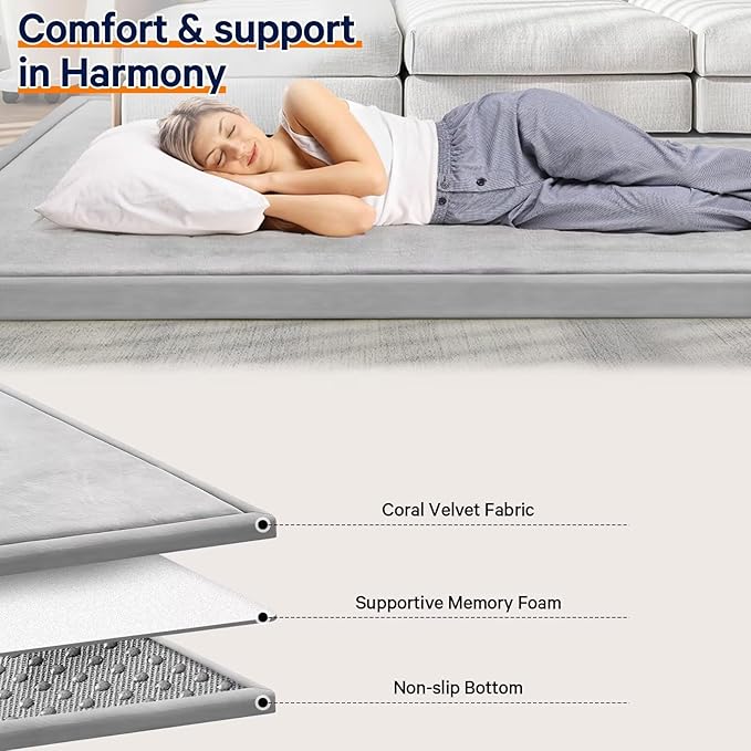 - 🐣SAFE & COMFY: Our baby play mat is made of 100% coral velvet material and filled with high-quality 3cm thick memory foam,eco-friendly and durable, providing a safe and comfortable play area for your little ones, without worrying about them hurting themselves on hard floors.The surface of this floor mat is velvet cover, which is not only soft and comfortable to touch, but also has a good cushioning effect.