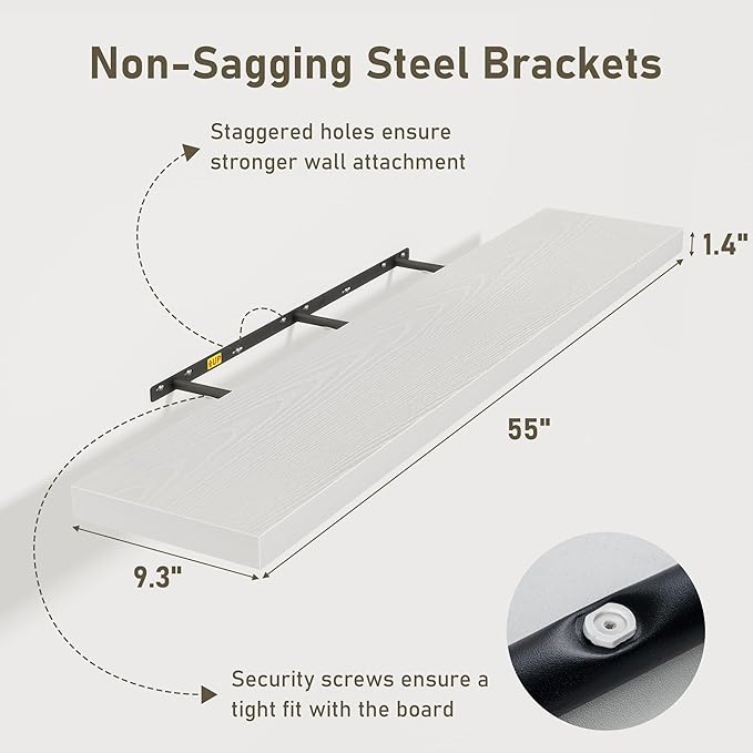 - 55 Inch Floating Shelves for Wall (Set of 2): Each wall shelves are 9.3 inches in depth and 1.4 inches in thickness. 2-piece set is more cost-effective and practical. Our wall shelf can be used in combination, staggered high or low on the wall, or mounted side-by-side to provide extra storage space for organizing small items and clutter in multiple areas such as kitchens, bathrooms, and bedrooms, creating a clean and smooth look. Multiple colors available