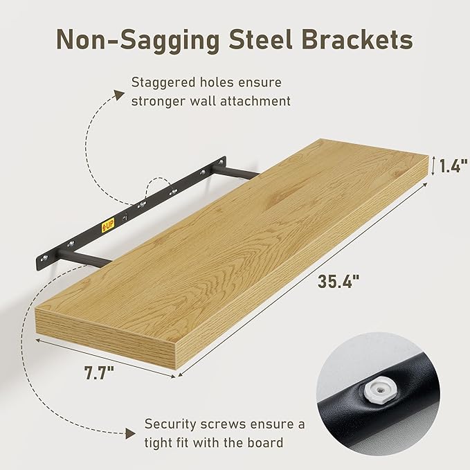 - 36 Inch Floating Shelves for Wall (Set of 2): Each wall shelves are 8 inches in depth and 1.4 inches in thickness. 2-piece set is more cost-effective and practical. Our wall shelf can be used in combination, staggered high or low on the wall, or mounted side-by-side to provide extra storage space for organizing small items and clutter in multiple areas such as kitchens, bathrooms, and bedrooms, creating a clean and smooth look. Multiple colors available