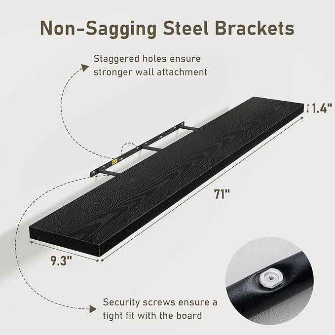 Fun Memories 72 Inch Floating Shelves for Wall 2 Pack Shelves for Bedroom|Kitchen|Bathroom 72 x 9.3 Inch Wood Floating Shelf with Invisible Brackets for Books|Storage|Decor, Black