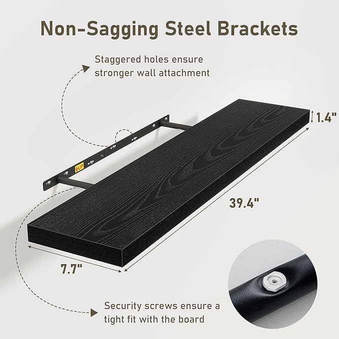 Black Floating Shelves Wall Shelf 40 Inch, 8 Inch Deep Floating Shelf for Wall, Farmhouse Black Wood Shelves Invisible Bracket for Living Room, Bedroom, Kitchen, 40 x 8 x 1.4 Inch, Set of 2