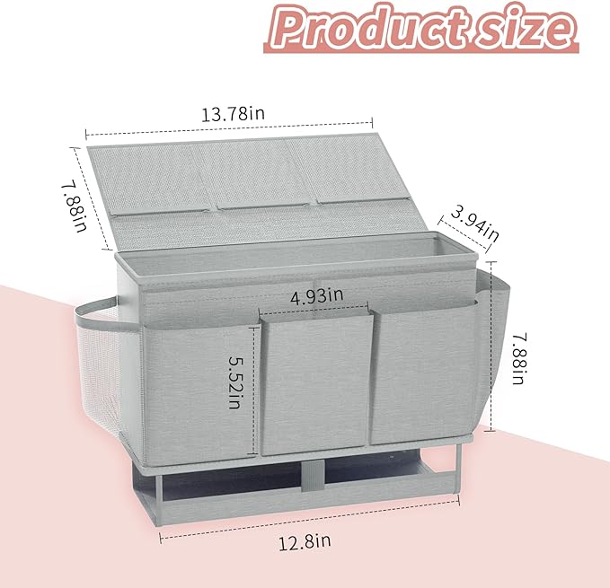 - Product Size: The overall size of the bed storage caddy: L13.78*H7.88*W3.94inch, pocket size: H5.52*W4.93inch, bedside storage is suitable for railing width less than 1.58inch.