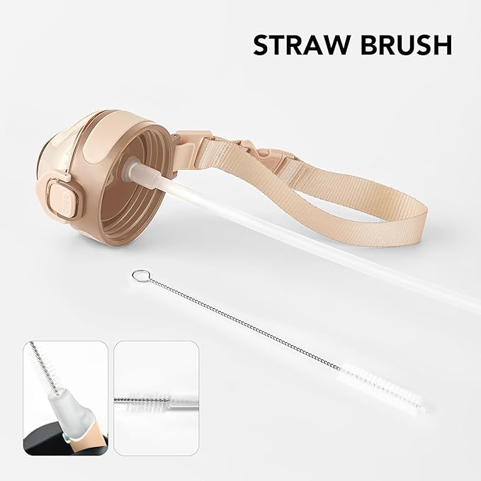 - Humanized Design: The one-hand operation button allows for easy access to water. Highly suitable for boys and girls, and all ages. The flip-top lid of the insulated bottle is used a secure lock, making it dust-free and leak-proof. The included straw brush makes maintaining your bottle's cleanliness uncomplicated and efficient.