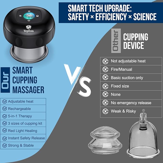 • 【5-in-1 Comprehensive Care】Combines standard cupping, dynamic cupping, red-light therapy, heat therapy, and cellulite relief in one device—perfect for gym recovery, office breaks, and on-the-go treatments.