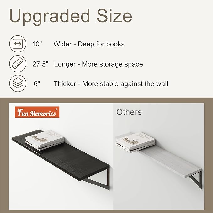 - 【10 INCH DEEP FLOATING SHELF】This extra deeper and wider wall shelves are 10 inches in depth and 27.5 inches in length instead of the regular narrow floating shelves, you can put photos, pictures, DVD players, videos, books, toys, and some other knickknack on this beautiful display wooden shelf.