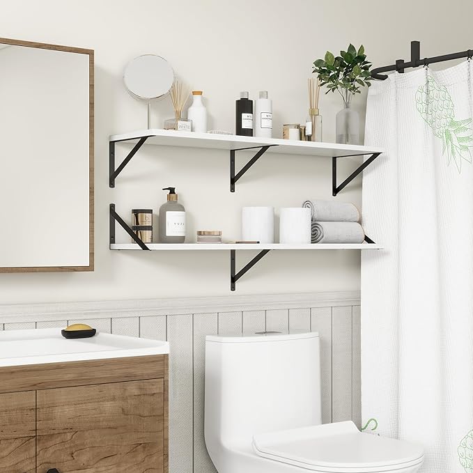 - 【DECORATIVE & FUNCTIONAL】The wall-mounted floating shelves are designed for decoration and storage, utilizing and decorating any space in your home. Used as shelf decor to show your collection, books, or prize, the hanging shelves are perfect for displaying your photo frame, small plants, model, or audio in your living room, office, study. And can also use as over the toilet storage shelf in the bathroom to hold toiletries or used as kitchen shelf to storage condiments.