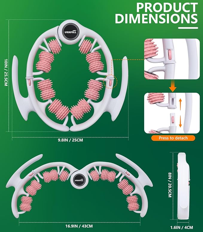 - 【Durable Split Design】The 8 independent 360° rollers feature a ribbed teardrop design to maximize results. Surrounding the area with targeted rolling action allows for a deeper massage that destroys cellulite.Durable split design can be also separated into two small single part with rollers and handle, to massage your neck, arm, foot and other most parts of your body.