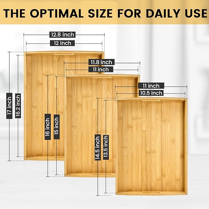 • 3 SIZES: Each set of wooden trays comes in 3 sizes. The large one (17" × 13" × 1.5") is perfect for displaying items or serving appetizers; the medium one (16" × 12" × 1.5") fits small spaces or coffee tables; and the small one (14.5" × 11" × 1.5") is stackable to save space.
