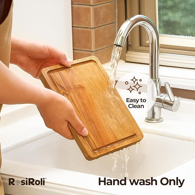 • Selected Wood & Knife Friendly - Crafted of solid natural acacia wood. Designed to protect the sharpest blades, our wood boards also provide stability during use and look handsome enough to keep out on the counter.