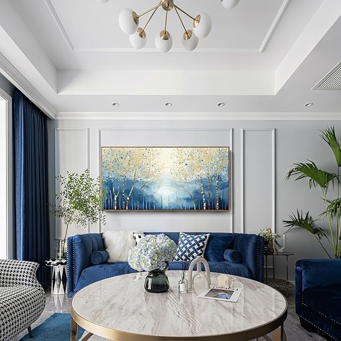 - Modern Abstract Forest Design: This giant minimalist landscapeartwork captures slender birch trunks reaching toward a luminous sky, showered with soft orange and navy-blue splatters that evoke morning light filtering through the trees. The calming blend of cool and warm hues makes it an effortless accent for any room.