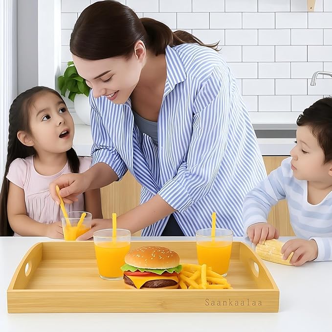 - Stylish & Versatile Design: This high quality bamboo tray set is well crafted, simple but with modern looking, light but sturdy. The gently curved tops of the end pieces add a touch of elegance. Large size 17" x 13" x 1.5", fantastic as wooden trays for serving food, tray for coffee table, or decorative piecesâevery detail is crafted for your comfort and joy.
