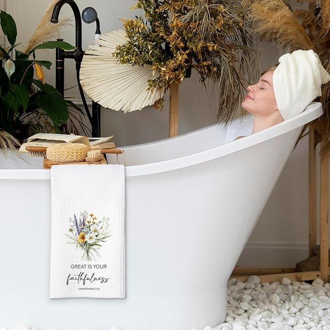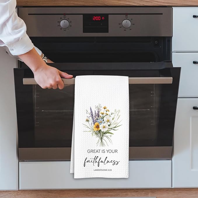 Christian Kitchen Towel, Waffle Weave Microfiber Scripture Hand Towel, Great is Your Faithfulness Bible Verse Farmhouse Decor for Kitchen Bathroom, Inspirational Gift for Women