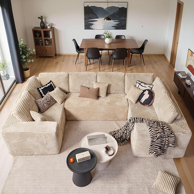 Cloud Sectional Couches for Living Room,U Shaped Modular Sofas No Assembly,135x79 Inches Plush Corduroy Oversized Floor Couch Set with Deep Seat Chaise,Beige