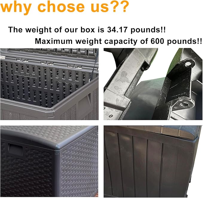 - Durable Resin Construction: Built with double-wall resin(HDPE), maximum weight capacity of 600 pounds,this outdoor waterproof deck box ensures long-lasting reliability and enhances strength and durability for long-term use,Our storage box is lockable, ensuring the safety of your belongings.