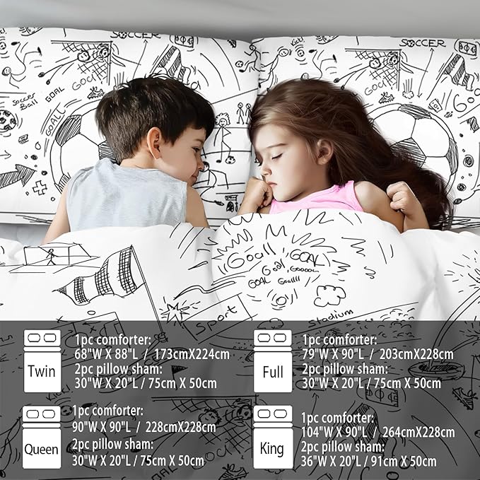 • Twin Size Soccer Comforter Set :This bedding set includes 1 comforter(67" x 85") and 2 pillowcases(20”x30”). In order to facilitate transportation, the quilt is made of vacuum compression technology. It will be slightly wrinkled when taken apart, but it will quickly regain its fluffiness if you gently beat it.