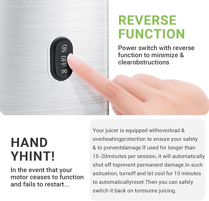 - [3.1-Inch Reversible Wide Chute & Auto-Cutting Power]: Our 3.1-inch feed chute is perfectly sized to accommodate whole apples and veggiesโno need for pre-cutting. Thanks to the powerful auto-cutting mechanism with dual crushing blades, your ingredients are sliced and juiced in a flash, saving you time and maximizing every drop of juice.
