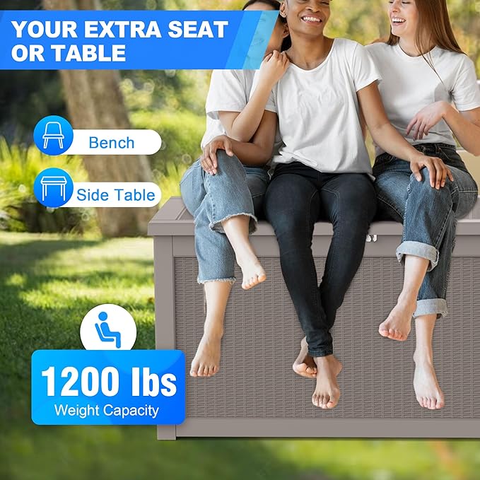 - 🌞【Multi-Functional & Space-Saving】More than a storage box – the reinforced flat lid doubles as a side table for drinks or decor. Its sleek wicker-style design blends seamlessly with outdoor decor while maximizing space efficiency in small patios or poolside areas.