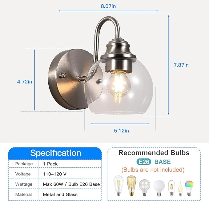 - ãStandard E26 Baseã: Our bath vanity light fixtures set require 2 x E26 medium base bulbs (Max 60W for each light, Bulbs not included). This wall lamp areCompatible with smart bulbs and dimming bulbs (without smart and dimming functions). 2700K warm white bulbs brings you relaxing and welcoming feeling, however 5000K daylight white bulb give you clean and energetic enjoyment (Max. 60W, Hardwire 120V)