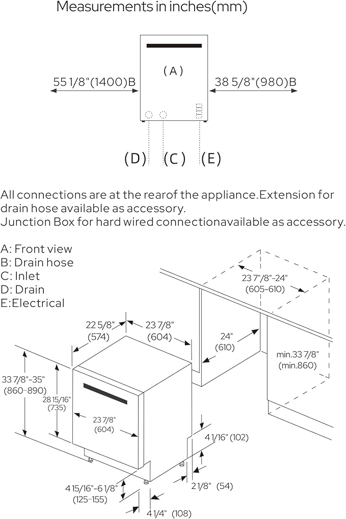 • Dimensions – 33 7/8" to 35” H x 23 7/8" W x 22 5/8" D; Cut-Out: 33 7/8" H to 35” H x 23 7/8" to 24” W x 24" D