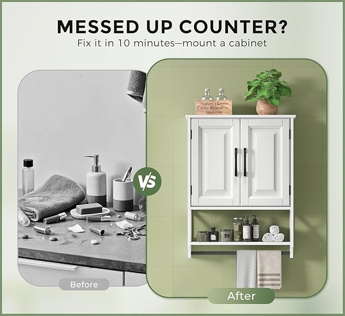 - Clean White Finish with Durable: Crafted from moisture-resistant engineered wood with a smooth white painted finish, this wall cabinets for bathroom storage offers a clean, timeless look that blends beautifully with modern and traditional bathrooms alike.