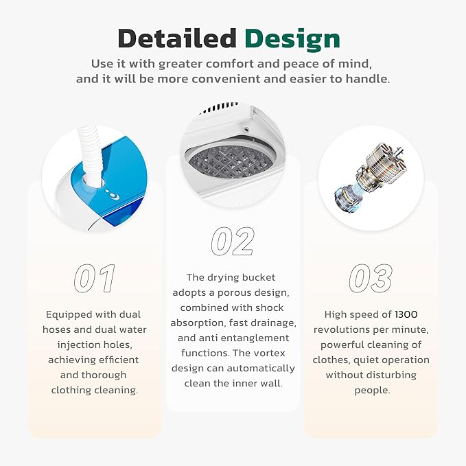 - [Professional Usage Tip] Capacity tip: Single wash <8Lbs (about 5 adult T-shirts), dehydration < 5Lbs; Balance technique: Spread the clothes evenly, cover the dehydration cover tightly to prevent shaking; Drainage instructions: Do not bend the hose, drainage height<20 inches.