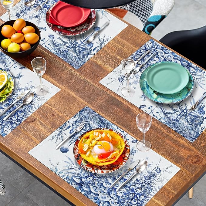 - TABLE DECORATION: Chinoiserie Christmas placemats feature high-definition printing technology for crisp, clear patterns and vibrant colors; rectangle placemats with a chinoiserie xmas tree pattern; unique and eye-catching seasonal patterns add charm to farmhouse table place mats, creating a winter and Christmas atmosphere for your party