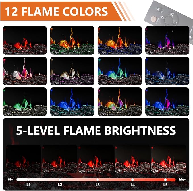 • 3-Side Glass Display Fireplace: The fireplace offers stunning panoramas of the flames from three angles. Featuring 5 settings for flame brightness, 12 colors of backlight and 12 LED colors of light strips.