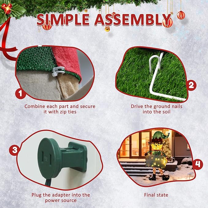 - Easy to Assembly: This Elf with envelope light uses Male-Female Connector. It only takes 3 steps to assembly. Step 1: Take out all the items from the package. Step 2: Assemble it according to the instructions. Step 3: Plug in the socket to light it up. If you are going to use this Elf for outdoor, donât forget the ground stakes included that will make it well fixed on the ground